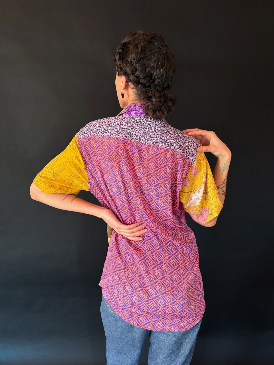 No encontrarás otra camisa igual, ya que todas las camisas de esta colección están hechas con retazos de telas reutilizadas de sari, por lo tanto, tu camisas será única.